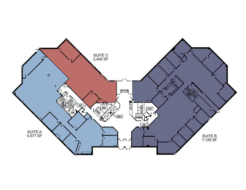 | SUITE C | 2,400 – 14,071 SF | Flexible configurations available up to 14,071 SF for entire 1st floor occupancy. |